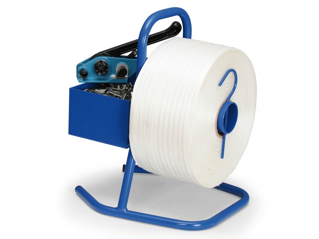 Kompaktní odvíječ pro PES pásku je vhodný pro páskování nákladu v malých a hůře dostupných prostorách, jako jsou kamiony, vagóny apod. Víceúčelová přihrádka na vazací spony může být použita i pro odložení napínače PES pásky. Pro průměr dutinky 76 mm.