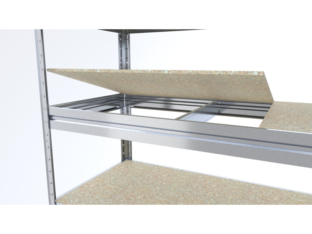 Velký regál s kovovou konstrukcí a policemi z dřevotřísky JSD 10 mm. Regály s policemi JSD jsou vhodné i do vlhkých prostor jako například přístřešky, pergoly, sklepy apod. Regály s policemi JSD nejsou určeny do exteriéru s přímým působením srážek. Rychlá montáž během pár minut - nosníky zasunete do stojinek a poklepem dorazíte díly na doraz. Tímto je zaručena vysoká stabilita regálu, ale i rychlost montáže - žádné šroubky! Stabilní a prostorný velký regál s nosností 400 kg na polici je vhodný pro objemnější a lehčí zátěže, výztuhy pod každou policí proti prohýbání polic.