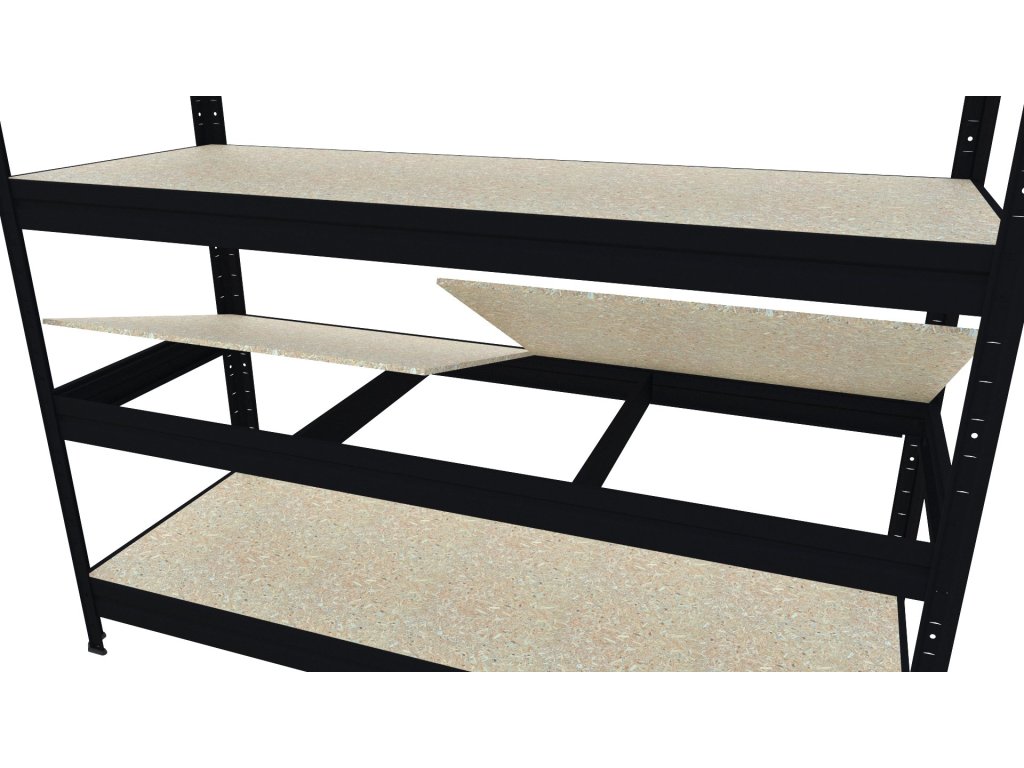 Velký regál s kovovou konstrukcí a policemi z dřevotřísky JSD 10 mm. Regály s policemi JSD jsou vhodné i do vlhkých prostor jako například přístřešky, pergoly, sklepy apod. Regály s policemi JSD nejsou určeny do exteriéru s přímým působením srážek. Rychlá montáž během pár minut - nosníky zasunete do stojinek a poklepem dorazíte díly na doraz. Tímto je zaručena vysoká stabilita regálu, ale i rychlost montáže - žádné šroubky! Stabilní a prostorný velký regál s nosností 400 kg na polici je vhodný pro objemnější zátěže, výztuhy pod každou policí proti prohýbání polic.