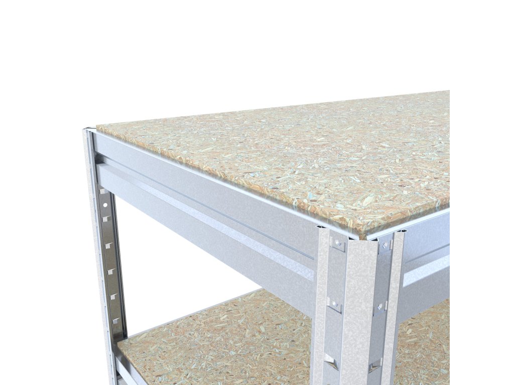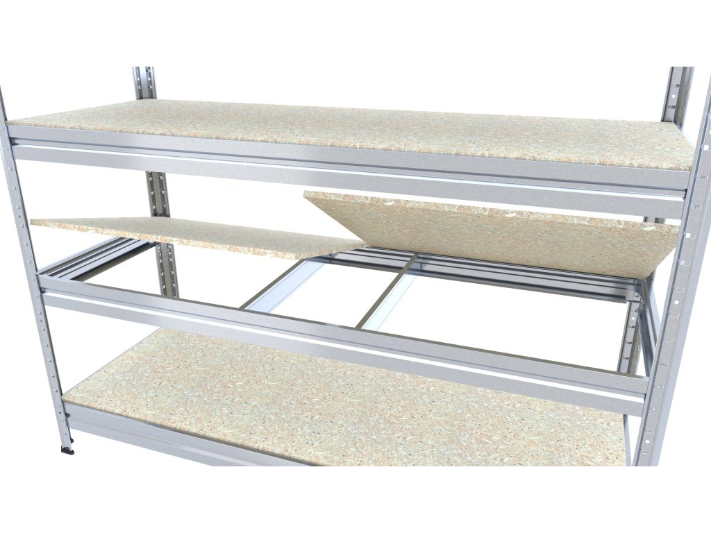 Velký regál s kovovou konstrukcí a policemi z dřevotřísky JSD 15 mm. Regály s policemi JSD jsou vhodné i do vlhkých prostor jako například přístřešky, pergoly, sklepy apod. Regály s policemi JSD nejsou určeny do exteriéru s přímým působením srážek. Rychlá montáž během pár minut - nosníky zasunete do stojinek a poklepem dorazíte díly na doraz. Tímto je zaručena vysoká stabilita regálu, ale i rychlost montáže - žádné šroubky! Stabilní a prostorný velký regál s nosností 400 kg na polici je vhodný pro objemnější a lehčí zátěže, výztuhy pod každou policí proti prohýbání polic.