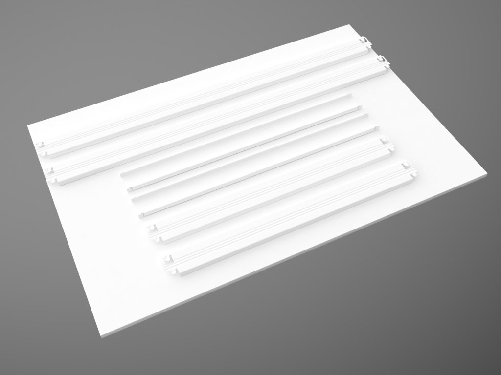 - Lieferumfang: ein kompletter Fachboden, wie auf dem ersten Bild oben in der Galerie dargestellt: Trägersatz, Versteifungen und Spanplatte weiß laminiert. Alles Nötige für die Montage eines Bodens.