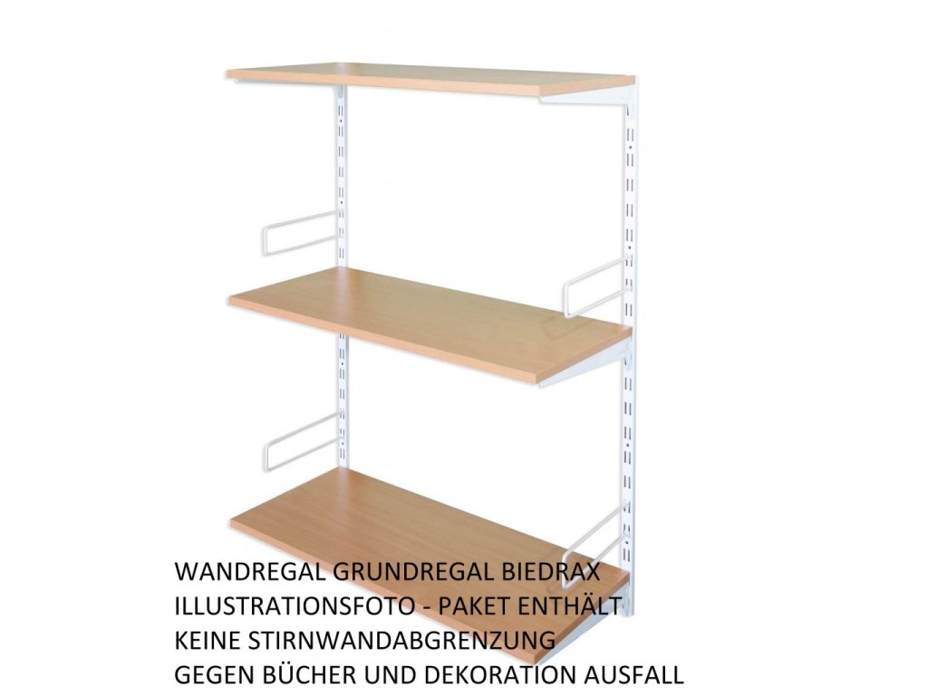 - Obsah balení základní regál: 2 kovové nástěnné lišty , kovové nosníky pod polici, police dřevotříska lamino 18 mm, šroubky pro připevnění polic k nosníkům.