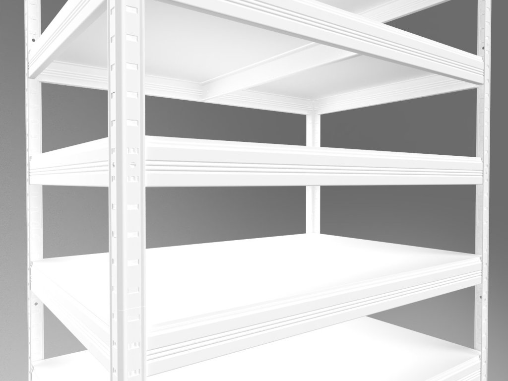 Regał gospodarczy z półkami z białej płyty wiórowej laminowanej o grubości 12 mm, wykończonymi ze wszystkich stron krawędzią ABS. Dzięki temu półki są bardziej odporne na wilgoć i łatwe w utrzymaniu – wystarczy przetrzeć je wilgotną szmatką, a następnie wytrzeć do sucha. Montaż jest szybki i prosty dzięki systemowi bezśrubowemu, co gwarantuje wysoką stabilność.