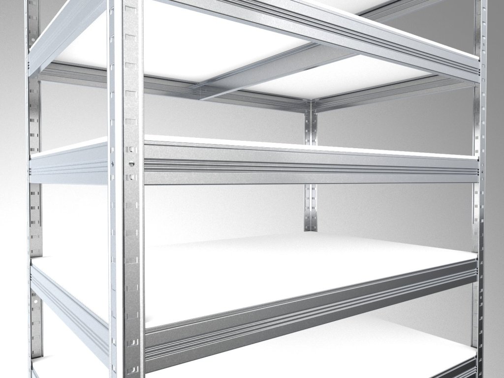 Regał gospodarczy z półkami z białej płyty wiórowej laminowanej o grubości 12 mm, wykończonymi ze wszystkich stron krawędzią ABS. Dzięki temu półki są bardziej odporne na wilgoć i łatwe w utrzymaniu – wystarczy przetrzeć je wilgotną szmatką, a następnie wytrzeć do sucha. Montaż jest szybki i prosty dzięki systemowi bezśrubowemu, co gwarantuje wysoką stabilność.