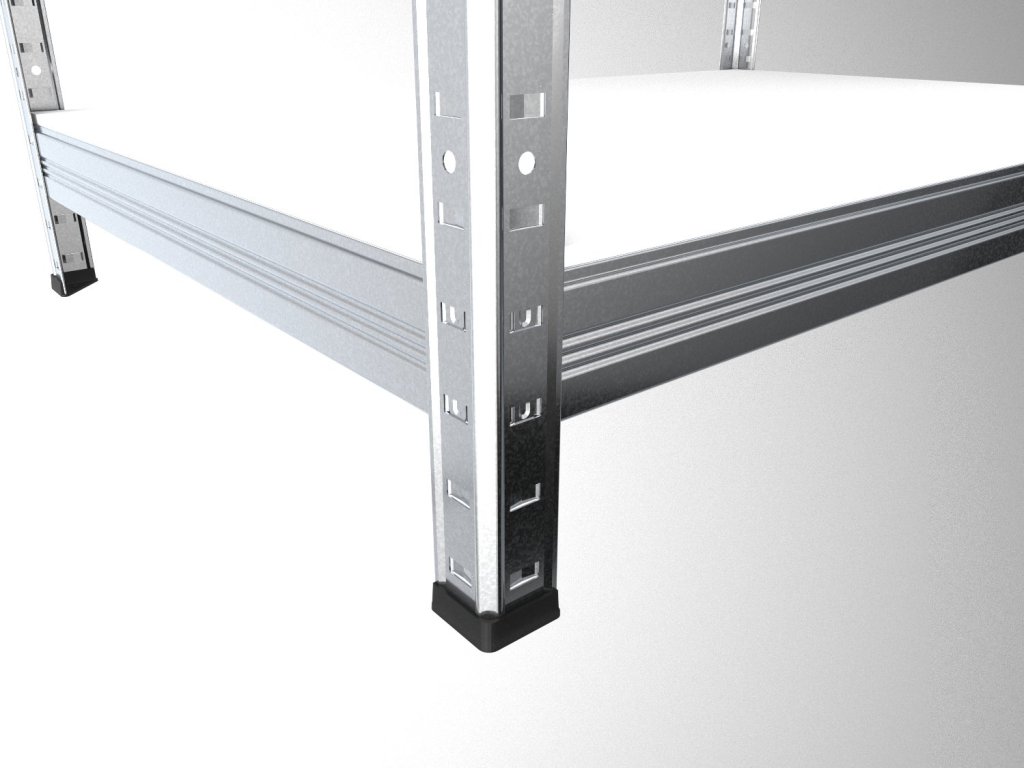 Regał gospodarczy z półkami z białej płyty wiórowej laminowanej o grubości 12 mm, wykończonymi ze wszystkich stron krawędzią ABS. Dzięki temu półki są bardziej odporne na wilgoć i łatwe w utrzymaniu – wystarczy przetrzeć je wilgotną szmatką, a następnie wytrzeć do sucha. Montaż jest szybki i prosty dzięki systemowi bezśrubowemu, co gwarantuje wysoką stabilność.