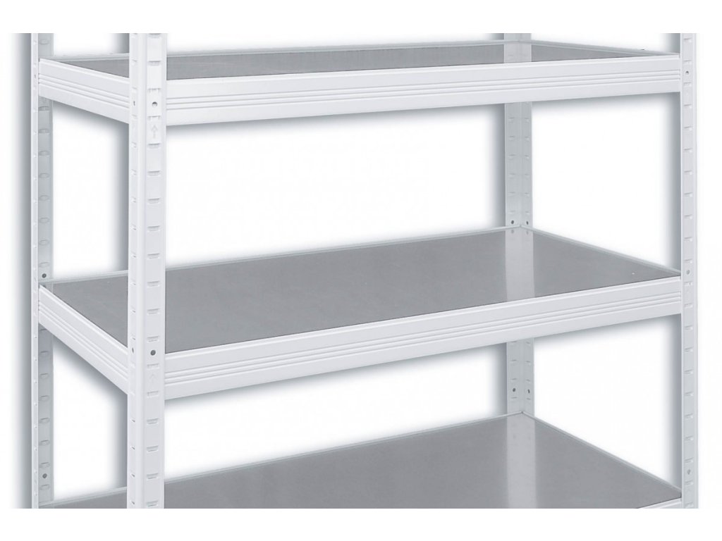 - PROSÍM POZOR - kovové stojiny, nosníky a výztuhy jsou lakovány vypalovací práškovou barvou bílá RAL9003. Ale police jsou vyrobeny z pozinkovaného plechu 0,8 mm, nejsou lakovány práškovou barvou, jedná se o pozinkovaný stříbrný plech.