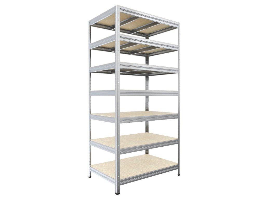 Bezskrutkový regál Biedrax 35 x 75 x 210 cm, pozink, 7 políc OSB 10 mm, nosnosť 300 kg na policu