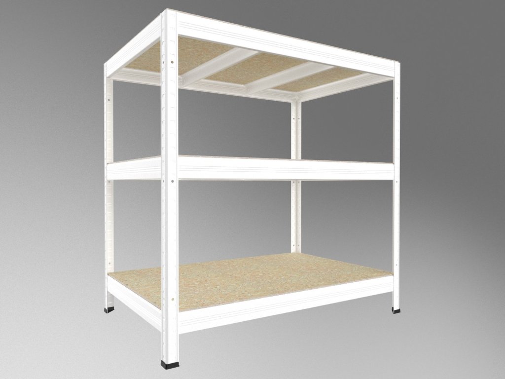 Bezskrutkový regál s policami z drevotriesky OSB 10 mm. Regály s OSB policami sú vhodné aj do vlhkých priestorov ako sú prístrešky, pergoly či pivnice. Nie sú však určené do exteriéru s priamym pôsobením zrážok. Unikátny bezskrutkový systém montáže umožňuje rýchle zostavenie – nosníky stačí zasunúť do stojín a zaistiť ľahkým poklepaním. Pevné spojenie bez skrutiek zaručuje tuhosť celej konštrukcie.