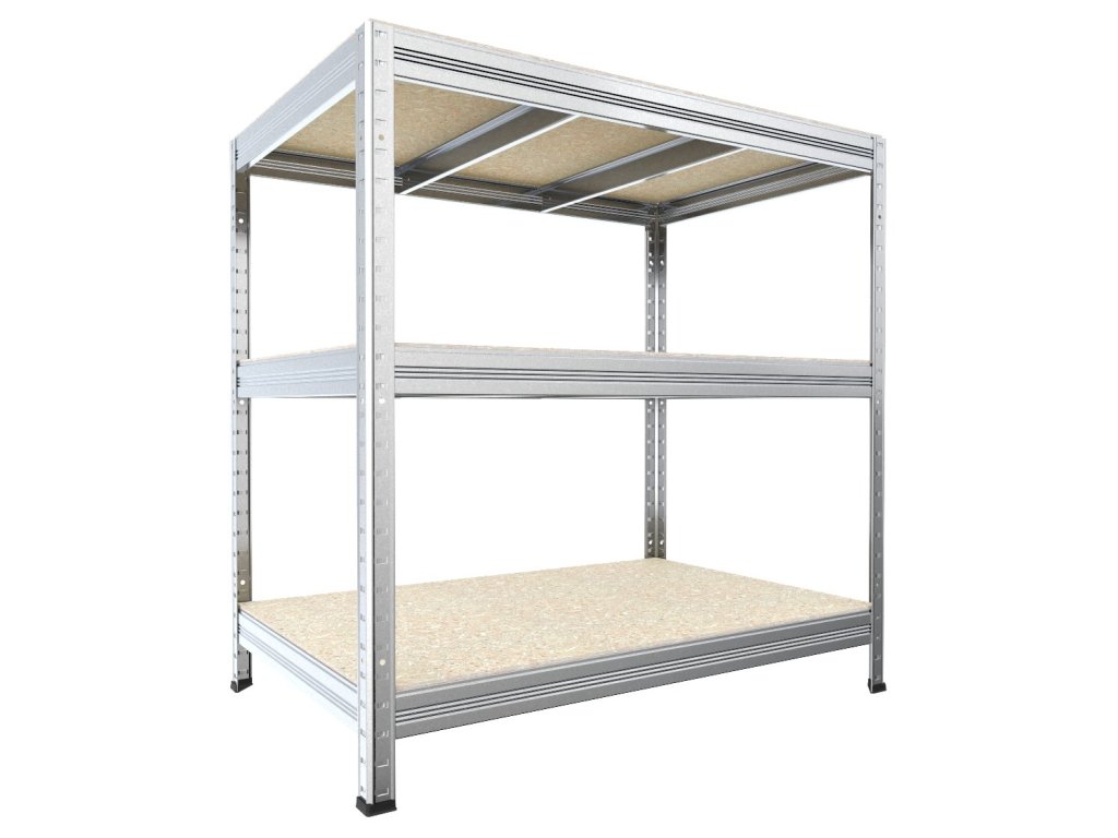Bezskrutkový regál s policami z drevotriesky OSB 10 mm. Regály s OSB policami sú vhodné aj do vlhkých priestorov ako sú prístrešky, pergoly či pivnice. Nie sú však určené do exteriéru s priamym pôsobením zrážok. Unikátny bezskrutkový systém montáže umožňuje rýchle zostavenie – nosníky stačí zasunúť do stojín a zaistiť ľahkým poklepaním. Pevné spojenie bez skrutiek zaručuje tuhosť celej konštrukcie.