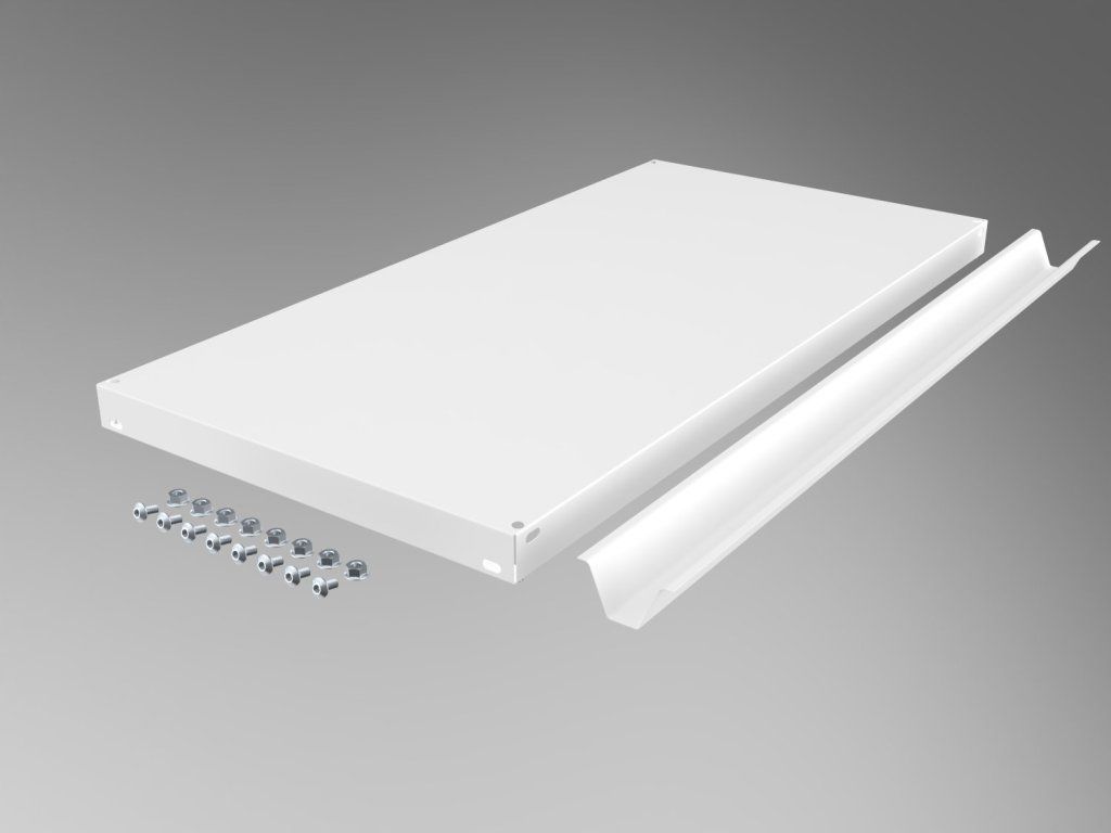 - Balenie obsahuje jednu policu s výstuhou a kompletný spojovací materiál (skrutky a matice) pre montáž priamo medzi stojky regálu.