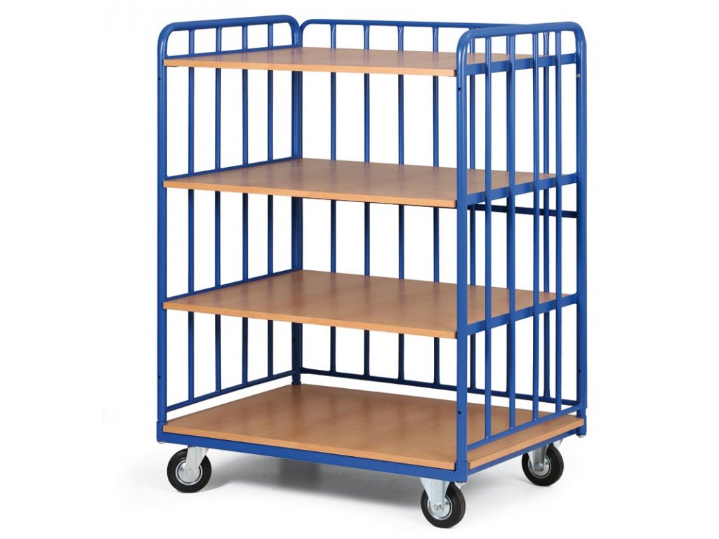 Dílenský policový vozík na přepravu zboží či materiálu. Konstrukce vozíku je svařena z ocelových profilů. Lakováno vypalovacím práškovým lakem v odstínu RAL 5005 - modrá. Police z dřevotřísky. Výplň madel a zad je z profilů o průměru 16 mm. Rozměr police je 1000 x 700 mm. Kola jsou vybavena poklicí, která brání namotávání nití a provázků a také zanášení ložiska různými nečistotami, čímž se prodlužuje životnost kola. Kola o průměru 125 mm jsou 2 pevná a 2 otočná. Kola lze na objednávku doplnit o dvojčinnou brzdou proti pojezdu i proti otáčení kolem svislé osy.